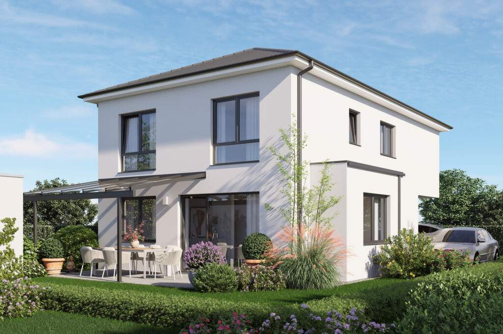 Das freistehende, moderne Haus mit Walmdach besteht aus einem Kellergeschoß, einem Erdgeschoss und einem Obergeschoss auf einem rund 356 m² großen Grundstück. Das Haus wurde geschmackvoll, modern und mit einer energieeffiziente Architektur (KfW 55/ Optional KFW 40) geplant.