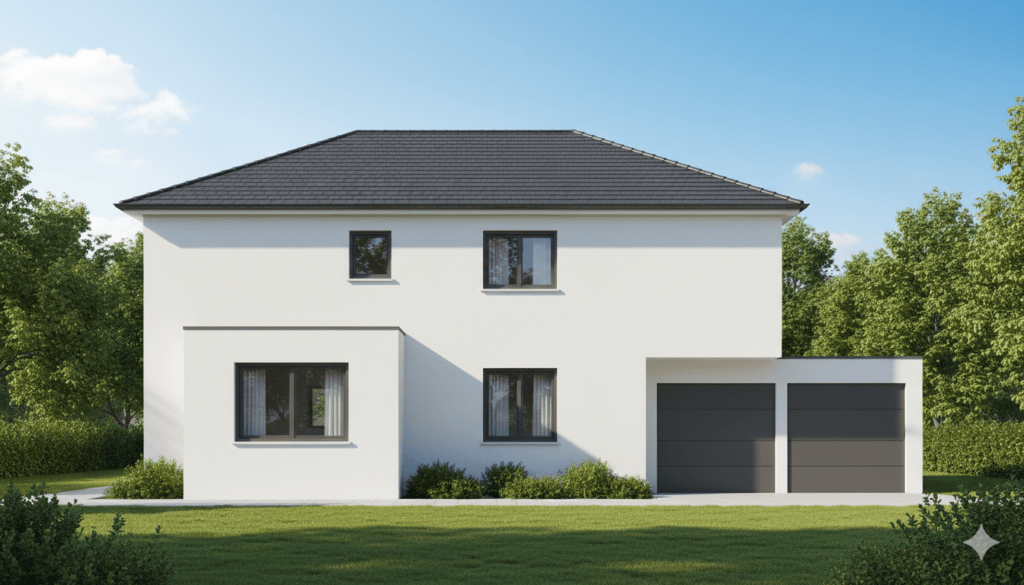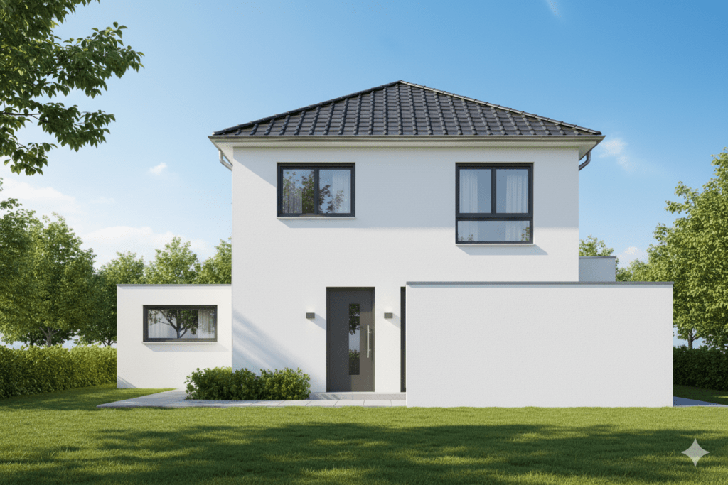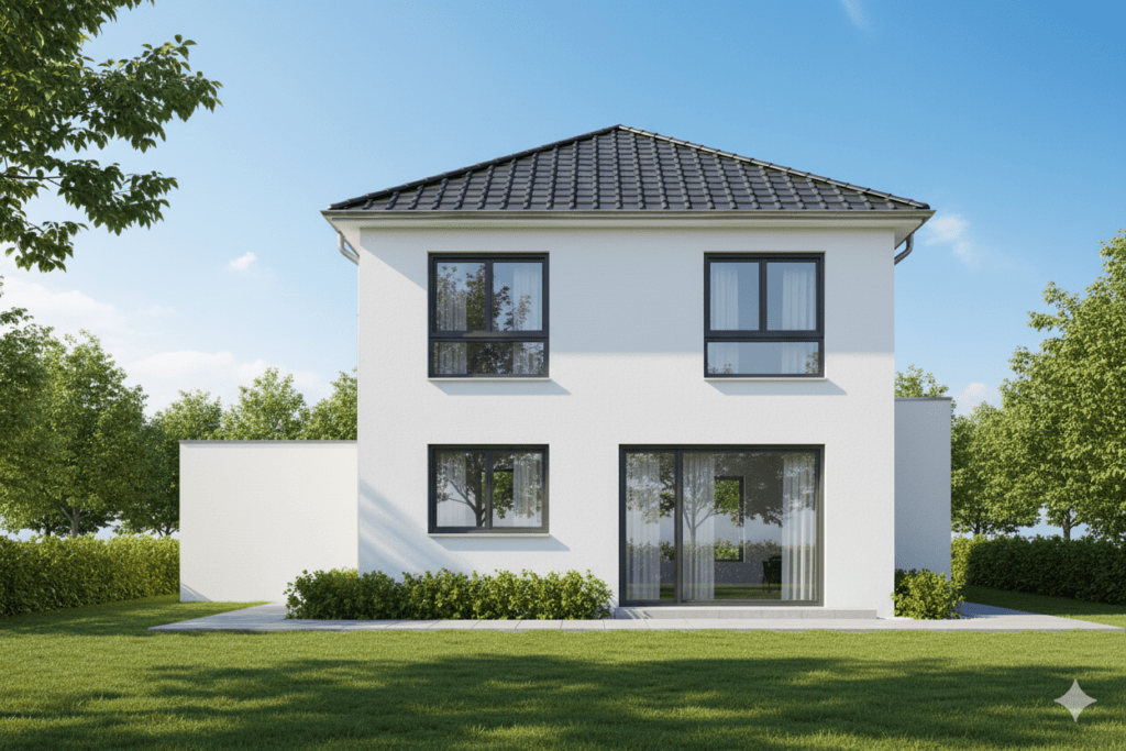 Die Außenwände werden aus 36,5 cm starkem Ziegelmauerwerk errichtet und in einem hellen, freundlichen Farbton ausgeführt. Die Fensterelemente mit Dreifachverglasung bestehen aus Kunststoff-Alu-Profilen und werden außen in einem anthrazitfarbenen RAL-Ton (nach Bauträger) ausgeführt. Im gesamten Haus wird moderne Netzwerktechnik für Homeoffice, Streaming und Smart-Home-Systeme verbaut und von der Netzwerkdose bis zum Patchfeld installiert – ideal für Homeoffice, Streaming und Smart-Home-Anwendungen